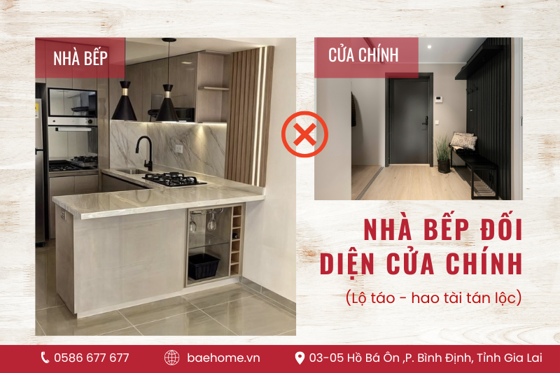 1. Bếp đối diện cửa chính – Lộ Táo, hao tài tán lộc
