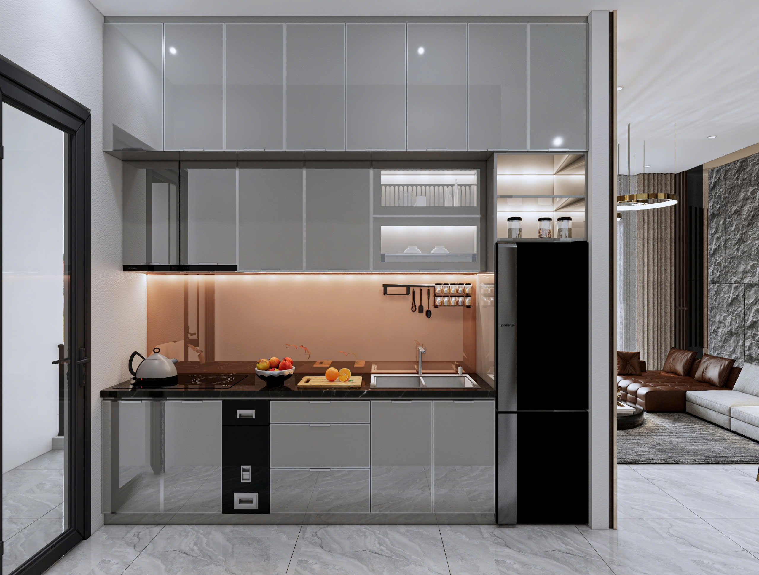 I. Những điểm nổi bật của mẫu tủ bếp chữ I – Khung nhôm, cánh kính cường lực tone xám nhạt
